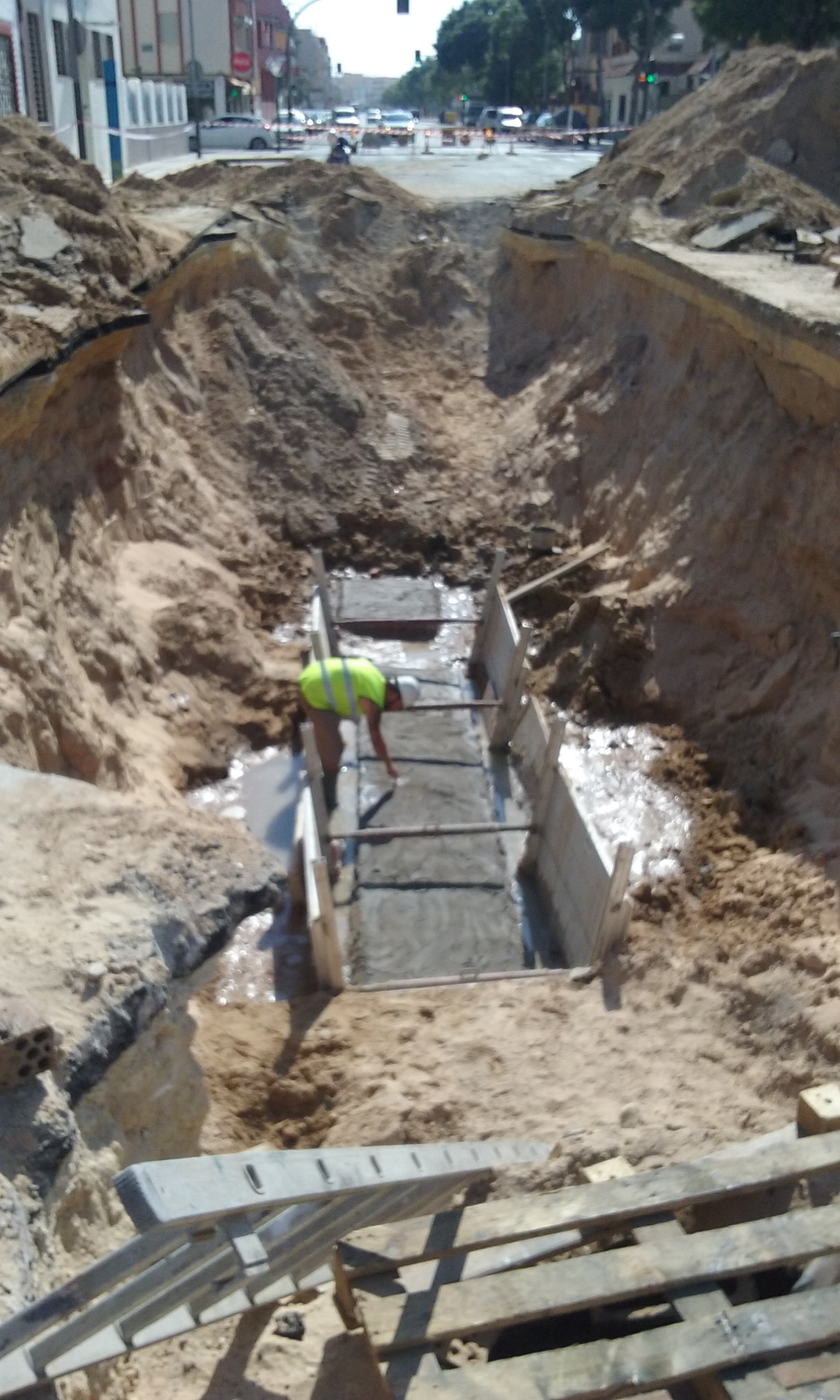 La reparación, de cierta envergadura por la profundidad a la que se encuentra la red, está consistiendo en el sellado de la parte superior de los tubos mediante hormigón armado con mallazo metálico. Esta operación quedó ayer finalizada y hoy Aqualia ha comenzado a rellenar la zanja para asfaltar el próximo viernes y poder así reabrir el tráfico lo antes posible.