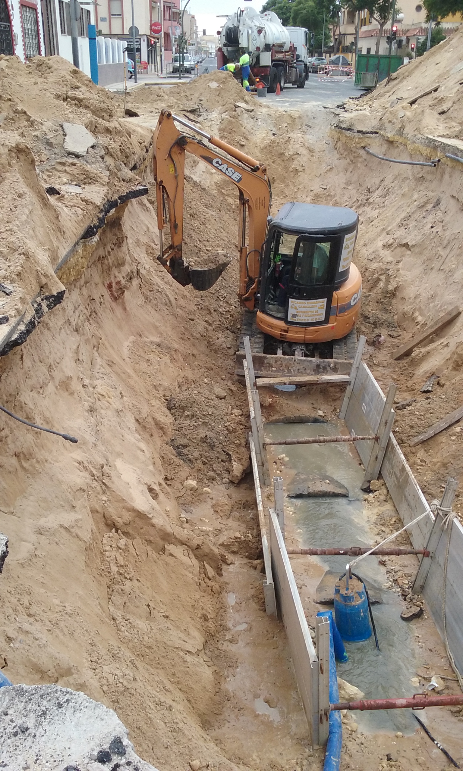Tres máquinas retroexcavadoras, dos de gran tamaño y una pequeña para acceder al interior de la zanja, dos camiones y un equipo de 9 personas se están dedicando en exclusiva a estos trabajos.