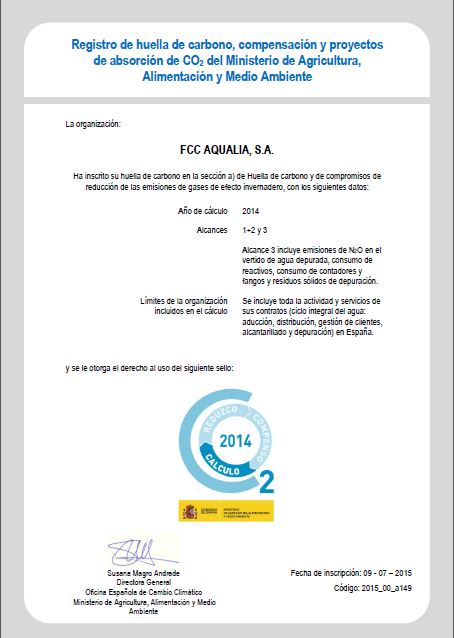 En 2014 Aqualia da un paso más al calcular la Huella de Carbono de la actividad relacionada con la construcción de plantas de tratamiento, depuración y desalación de aguas y sus instalaciones anejas, desarrollada por aqualia infraestructuras. Este trabajo se completa con su inscripción en el Registro de Huella de Carbono del Ministerio de Agricultura, Alimentación y Medio Ambiente.
