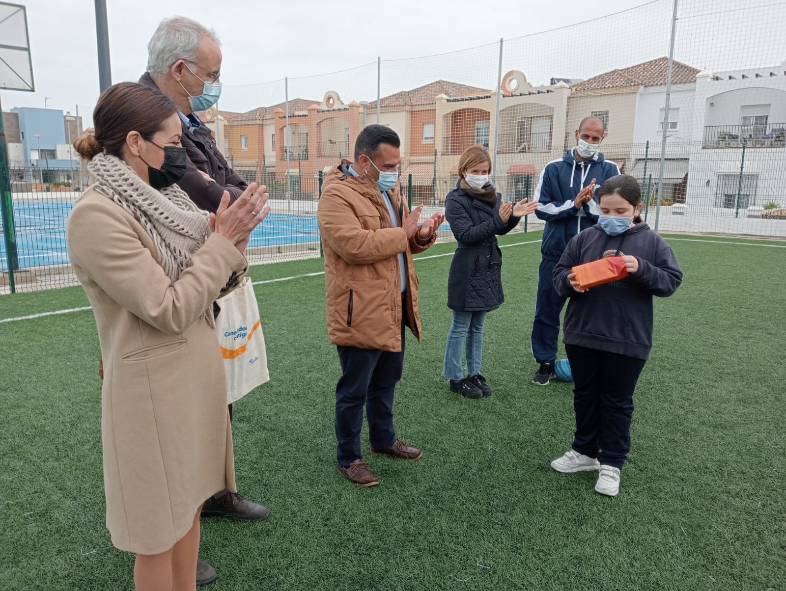 El Concejal Delegado de Medioambiente del Ayuntamiento de Rota, Manuel Jesús Puyana, y el Jefe de Servicio de Aqualia en Rota, Antonio Gragera, han hecho entrega en un acto celebrado en los respectivos colegios de cada alumna premiada, de un smartwatch a cada finalista.