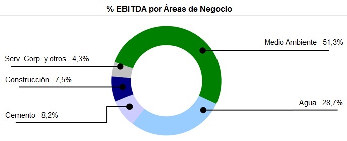 En la evolución del Ebitda de las áreas de negocio, es de destacar, por su mayor contribución al Grupo, el comportamiento del área de Medio Ambiente que registró un crecimiento del 3,7% y alcanzó los 441,4 millones de euros. También destaca el área de Cemento con un incremento del 22,7% hasta los 70,9 millones de euros, apoyado por la mejora del negocio en España. Por su parte, el área de agua registró 247,5 millones de euros, un 2,5% más que el año anterior; y  Construcción alcanzó los 65 millones de euros, un 7,6% menos que el año anterior, que se explica por la evolución en la que se encuentran las obras en ejecución.