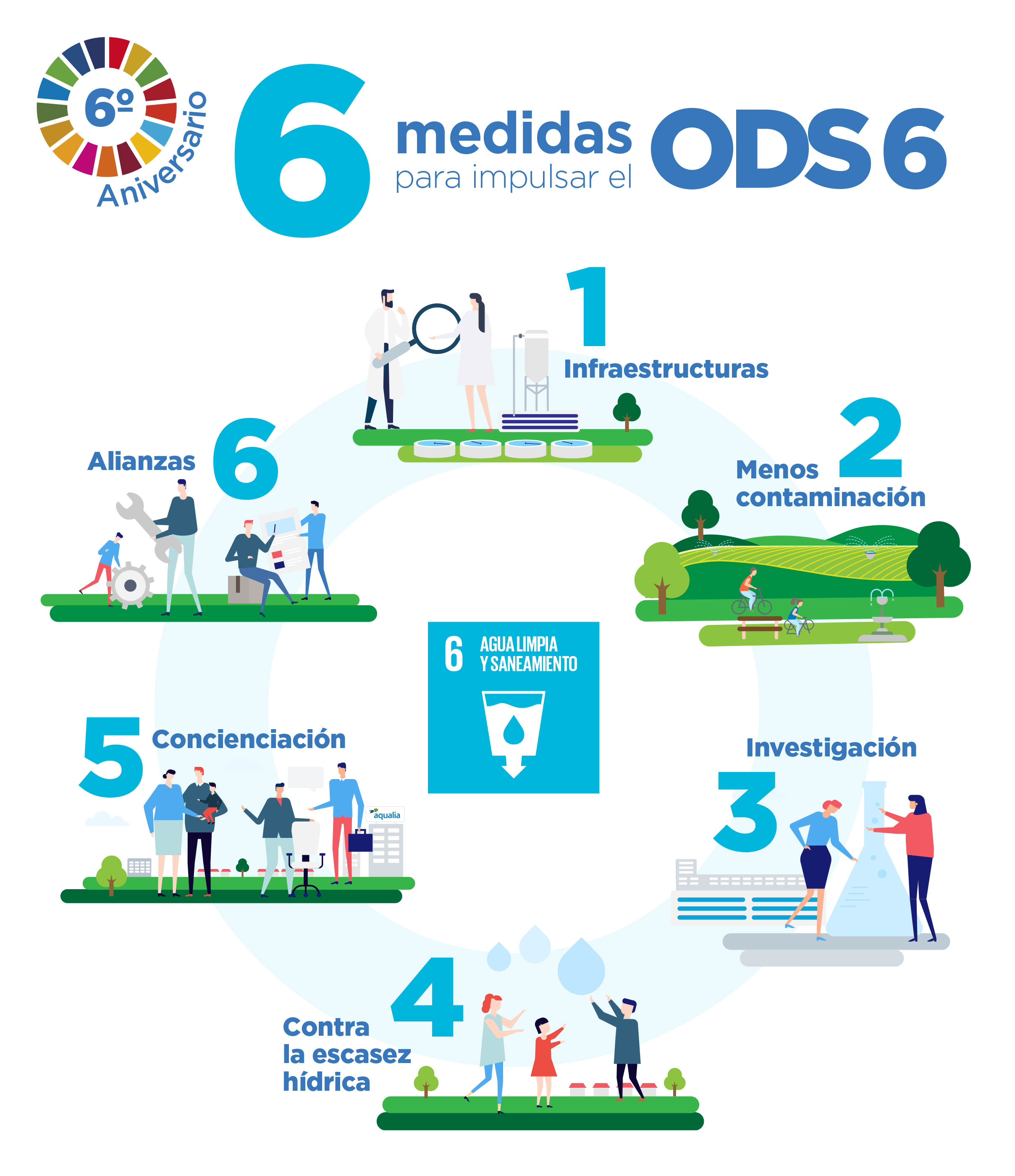 Todos estos vídeos se han difundido también en redes sociales con el hashtag #apoyamoslosODS y, además, con motivo de este sexto aniversario, Aqualia ha creado un nuevo espacio en su web aqualia.com donde recopila, con elementos multimedia adaptados para todos los públicos, información de interés acerca de los ODS y las seis medidas principales para avanzar en el cumplimiento específico del ODS 6, uno de los pilares de la Agenda 2030.