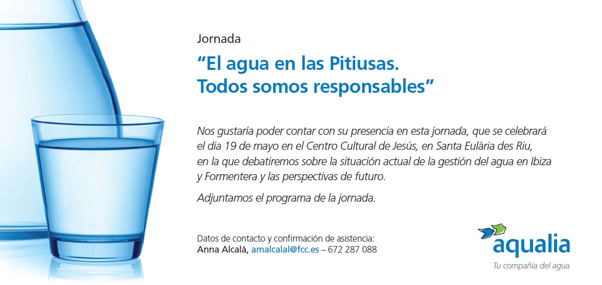 El Centro Cultural de Jesús, en Santa Eulària des Riu, acogerá este jueves día 19 de mayo, la jornada “El agua en las Pitiusas. Todos somos responsables”, organizada por Aqualia y que contará, entre otros, con la Directora General de Recursos Hídricos del Govern Balear, Joana Maria Garau, el Presidente del Consell d’Ei...