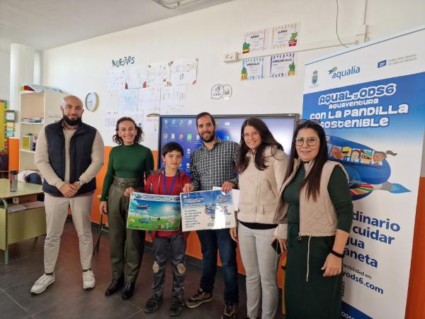 El escolar Ian Sialer Pérez, del CEIP Nuestra Señora de la Luz, ha recibido su premio de manos de la alcaldesa Olivia Delgado, del concejal de educación Agustín Tejera Dorta y del jefe de servicio de Aqualia en Arico, David Curbelo