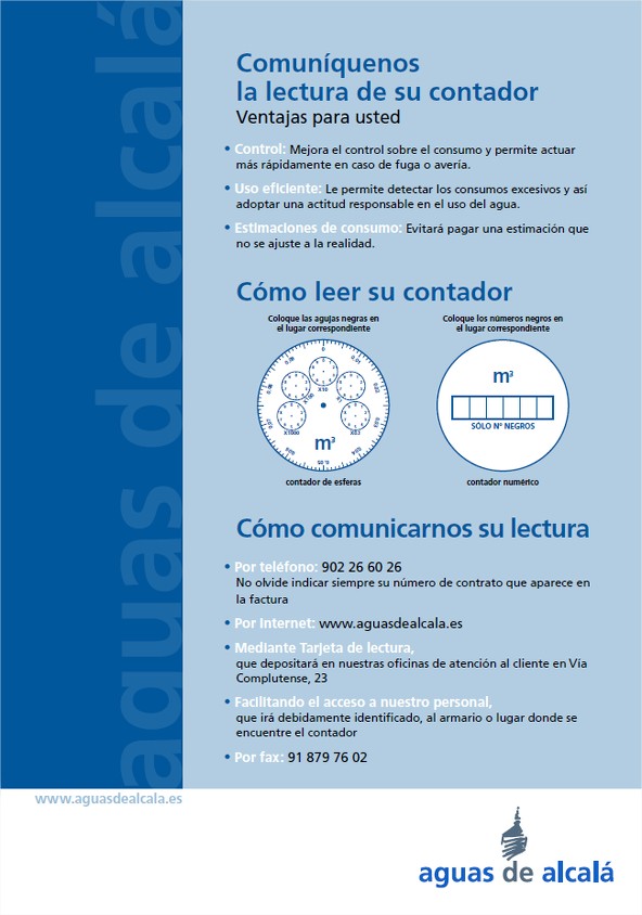 - Por correo ordinario a Aguas de Alcalá, Vía Complutense 23, 28807 Alcalá de Henares