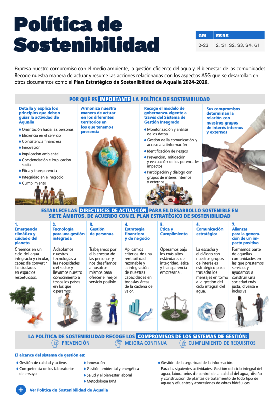 En Aqualia, nuestra gestión del agua va más allá de la técnica y la innovación; se fundamenta en una cultura de ética, transparencia y responsabilidad.