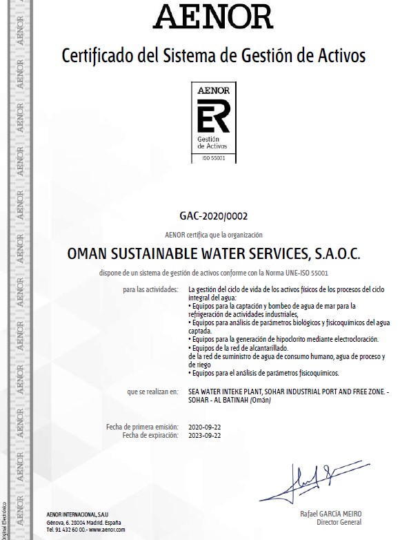 OSWS (Oman Sustainable Water Services SAOC) obtiene la certificación de AENOR ISO 55001 de gestión de activos. El consorcio, formado por Aqualia y la empresa Majis, gestiona las infraestructuras hídricas del puerto de Sohar (Omán)